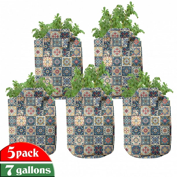 Moroccan Grow Bags 5 Pack Portuguese Tiles Motif Heavyduty Fabric Pots With Handles For Plants 2 Sizes Dark Blue Amber Red By Ambesonne Walmart Com